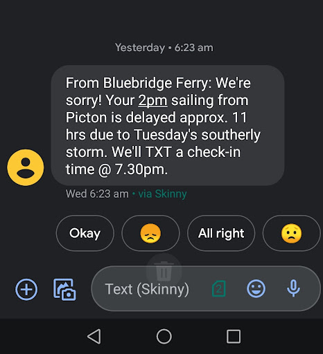 Bluebridge sent us an SMS and email indicating the delay around 6 am on the day of departure (17 Feb). The SMS states it would be approx eleven hours delay and would get back to us at 7.30 pm that night regarding our new departure time. We were in Motueka then.