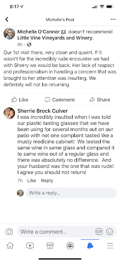 Local friends beware of this venue. Not worth the hassle that we experienced last night and she is the owner! We both ordered one sampler each, both being different so we could try one anotherās. Each contained 4 samples of wine. They brought them out in small clear plastic cups with little paper stickers that had the initials of the name of the wine typed on them on a black plastic tray. After tasting his first pick, Joel immediately commented to me he didnāt care for that particular one. I didnāt think anything of it. After sampling his second choice and tasting a little of mine he had observed the funny taste and smell that was coming from the small plastic cups. Thatās when I started to pick mine up and smell. A couple of my wines were sweeter and had bolder flavor so their aroma and taste overpowered the strength of what he was experiencing. I sipped his first sample, it tasted like medicine, literally. The cup had a weird overpowering odor, like when you store something in a cabinet for a long time. His first sample was acclaimed to be their ābest sellerā. There is no way that could be their best seller off of what we were tasting. After trying his second sample and getting the same feedback from me he walked up to the front and said something. Our young waitress followed him back and gathered up our samples and took them away. She then brought out a sample in a wine glass, after sipping it he told the young waitress that he liked it and the taste was vastly different than what he had experienced trying it out of the plastic cup. Sherrie followed a few minutes after, her body language and tone reflecting exactly how she felt; offended. She did not take his complaint lightly and was incredibly and distastefully rude. She told Joel she had gone to the back and drank from his plastic cup and then poured the same wine in a glass, she stated her comparison results were the same. She even made the comment āI hope you donāt have Corona because I drank after youā. She proceeded to argue with him in open on an outside patio, she was loud and disrespectful. She stated a couple of times she wouldnāt charge us for the samples, he tried to explain to her that it wasnāt about the money, that he was just trying to inform them of his experience so that someone else wouldnāt have to sample their wine in musty smelling/tasting cups. The samplers were $5 each, we definitely could afford $10. We had packed and brought a cheese platter with fruit and an olive salad that exceeded the amount of the wine we were sampling. To say that Iām disappointed is an understatement. I looked forward to this date all week, itās the first time weāve been OUT since the pandemic and my surgery. To have it ruined by an over sensitive grown woman because she couldnāt stomach constructive criticism over PLASTIC CUPS is...
