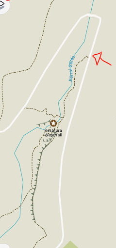 The best option is the one highlighted yellow. There’s a spot for parking on the side of the road. You need to jump over or crawl under the road safety barrier. Otherwise it’s a pretty easy walk down to the river (don’t cross the bridge), then a scramble down to the bottom of the waterfall.