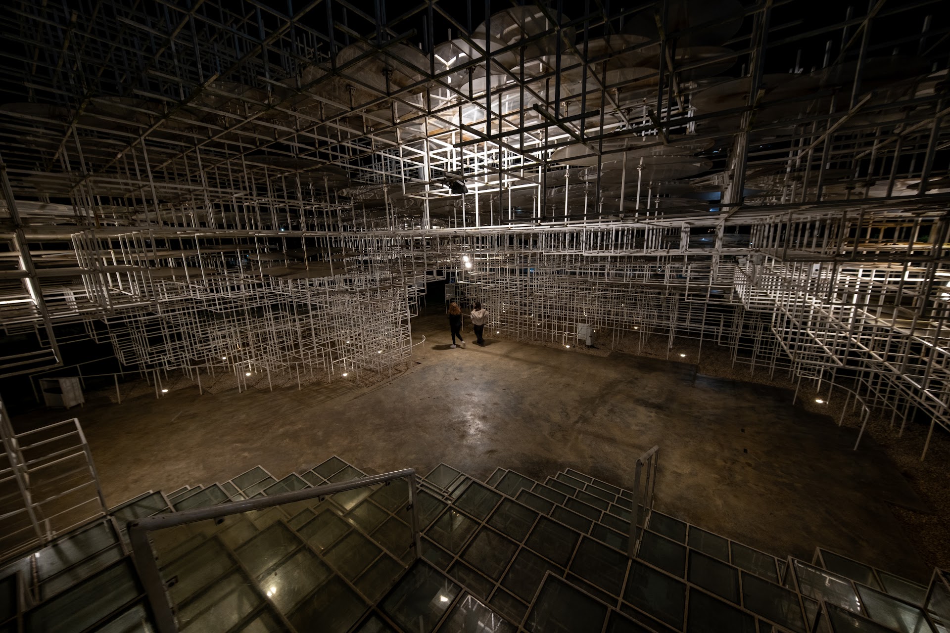 The Pavilion is a delicate, three-dimensional structure; each unit comprises fine steel bars of 800 and 400 mm rectangles. It forms a semi-transparent, irregular canopy, simultaneously protecting visitors from the elements while allowing them to remain part of the landscape. The footprint of the structure is 350 square-metres and the Pavilion has two entrances. A series of stepped terraces provide seating areas that allow the Pavilion to be used as a flexible, multi-purpose social space. The delicate quality of the structure, enhanced by its semi-transparency, creates a geometric, cloud-like form, as if it were mist rising from the undulations...