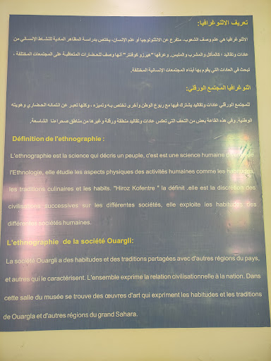 Musée d'Ouargla avec peu de matière archéologique exposée . bien que la région de Ouargla et le sud Algérien en général est riche en matière des plusieurs civilisations de la région... Mais comme même on y trouve un peu d'affiches de la préhistorique saharien Il peu être mieux exploité et enrichi en produits archéologiques ... j'invite a visité cette...