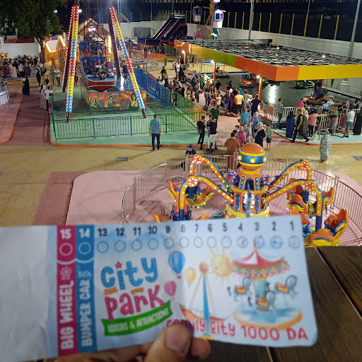 Petit park convivial, agréable pour passer un moment avec les enfants Accès parking 50 da, accès au park gratuit, attractions par points, la majorité accessibles avec un points, certains jeux sont cotés à deux points comme ( bateau pirates, les voitures tamponeuses, la grande roue) Certains jeux ne peuvent pas être réalisés pour les enfants de tailles supérieure à 110 cm comme ( les trampolines et les gonflables) 200 da - 3 points 1000 da -17 points Soit 70 da 1 jeux simple et 140 da un jeux sensation forte. Café et boissons disponibles, Mhadjeb, pop corne, barbe à papa magasin de...