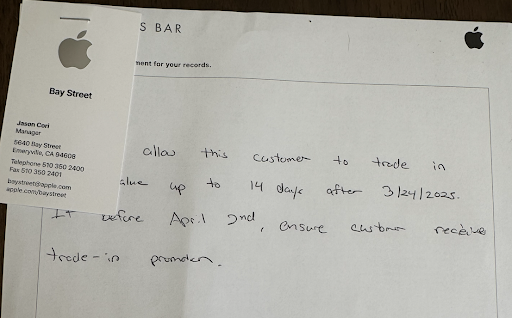 They had told me before, when I was trying to reset my password that, worst case scenario, it could take SEVERAL DAYS for the password to reset via Apple, but that I could still get the trade in credit if I turned my device in within 14 days. I had explained previously that I was going out of town for 10 days, starting in 2 days, so that was cutting it close. Moreover I wanted them to at least do me the courtesy of giving me the same $375 credit for my old laptop as I had been offered today. Not taking his word, I asked for it in writing, so he said he would get his manager to write something up to that effect, and disappeared for another 10 minutes.
