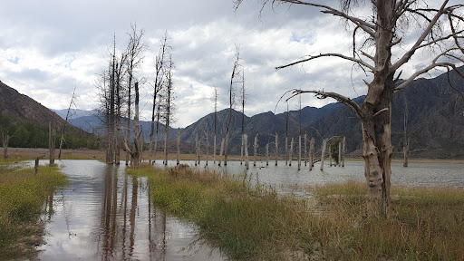 Leo muchas publicaciones que ignoran el origen del lugar, primero que ese predio fue parte de un camping que quedó bajo el agua desde hace años cuando se llenó el Dique Potrerillos, con los años bajo el nivel del agua y quedó descubierta la vieja ruta y parte de los álamos del camping los cuales algunos se secaron y otros sobrevivieron por la resistencia misma de esa planta, NO ES UN LUGAR HABILITADO, la gente por cuenta propia se fue metiendo al ver el paisaje que se formó y fue utilizándolo para hacer picnic... Criticar la vegetación, la falta de servicios, la extracción de tierra, o la falta de cartelería para el turista es ignorar que el lugar no es punto turístico simplemente es un lugar que la gente utiliza de manera espontánea y que así como hoy está mañana por una crecida vuelve a quedar bajo el agua.. antes de ir preguntar a los lugareños.. es parte de ser turista interiorizarse del lugar que se visita. Fotos del...
