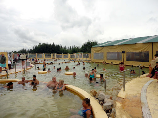 Además, la publicidad del lugar es engañosa. Prometen aguas termales, pero en realidad solo una piscina está calentada y es tan pequeña que la gente se chocaba entre sí constantemente. Las demás piscinas estaban frías y carecían de cualquier sensación de ser termales. La falta de baños suficientes para la cantidad de visitantes, sumado a su pésima limpieza, hizo que la experiencia fuera aún peor. Las piscinas estaban llenas de plumas y bichitos, algo completamente inaceptable por los precios que cobran.