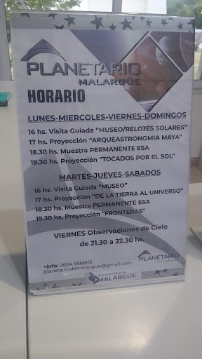 Es un imperdible de Malargüe, tiene dos horarios para asistir a la visita guiada y a las proyecciones dentro de la pirámide. Las ubicaciones son numeradas así que recomiendo ir temprano porque los últimos números tienen peor ubicación y además podrías quedarte sin lugar si va MUCHA gente (igual, yo llegué unos minutos más tarde del comienzo de ese turno de la guía y conseguí un lugar). Las proyecciones son algunas muy buenas, otras decentes, pero lo que está muuuy bien son las explicaciones de quien habla en ese momento, muy claras e interesantes. La primera parte, en qué un guía acompaña el recorrido por el resto del planetario es un poco pobre porque un solo guía se hace cargo de todos los stands lo que hace que las explicaciones de cada uno sean muy superficiales. Podría solucionarse con un poco más de personal. Es económico, la visita cuesta $200 por persona (adultos), y los horarios de visita son 16hs y 20.30hs, durando 2 hs...