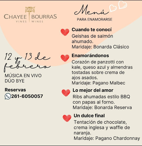 Read moreFuimos a cenar, con la propuesta de san valentín que era un menú de 4 pasos. Los platos estuvieron bien y con una linda presentación, por ahí estaría bueno que los pasos tengan alguna coherencia entre si ya que comimos geishas de salmón, pastas y ribs de cerdo con barbacoa a mi entender podrían trabajar en esa propuesta. Destaco la atención de los mozos y la belleza del lugar, ya que comes debajo de los parrales. Les bajo la calificación por qué solo operan con transferencia bancaria y efectivo lo cual es raro en una bodega de estas características que en el año 2022 no reciba tarjetas de débito y crédito y que no lo comuniquen al realizar la reserva, ni en ningún momento hasta que...