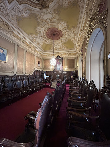 Hall of Degrees During the Jesuit period, this space constituted the Chapel of the Spaniards, located next to the central nave of the Church. In the middle of the 19th century, the University transformed the old chapel into the Degrees Hall and here the thesis defenses began to take place. It has a European style, with damask silks on the walls, boiseries and chandeliers. The paintings of the vault show interventions of different periods. The oldest painting is formed by the two shields located at the ends. In the center, an allegory of the muses that bear the university shield appears.