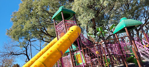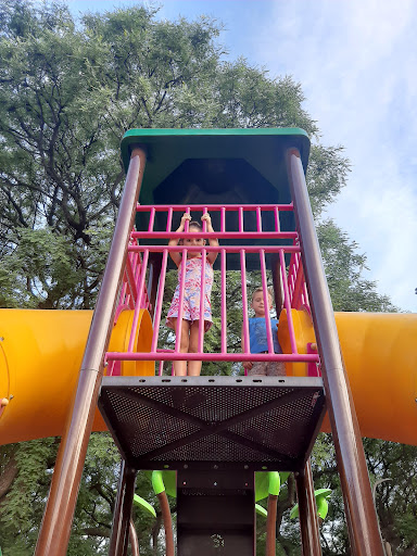 Nice clean shaded plaza in a good neighbourhood with plenty slides, swings etc for the kids. Some cafes/restaurants and shops around the plaza. At night (until 3am on a workday) around the square very noisy with youths playing loud music in their cars while driving...