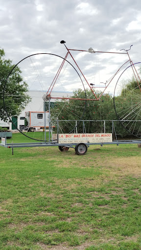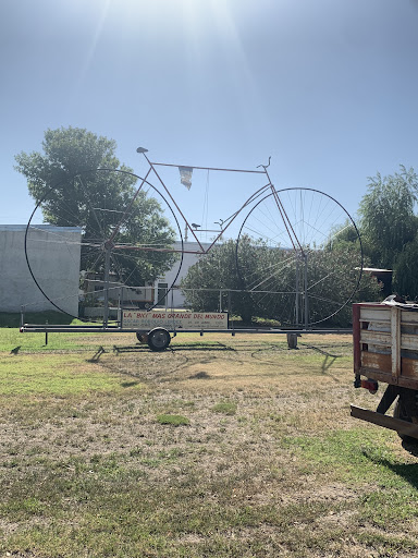 Es una bici de aproximadamente 5 mts alto por 9 mts de largo, está en un predio a 100 mts de la ruta nacional 8, se encuentra cerrado por un alambrado y solo se ve desde la vereda. Es una lastima que no lo exhibiera en una plaza, así muchas más personas lo pudieran conocer, tendrían que las autoridades municipales atender este...