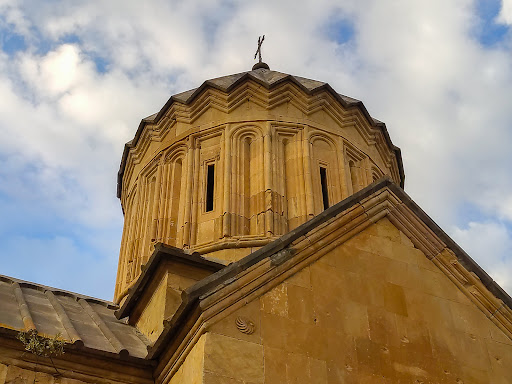 the center of the church interior, arched pendentives support the drum and dome above. High-relief carvings of mythical creatures adorn each of the four stone panels between the pendentives and base of the drum. Small vertical windows around the drum as well as small windows at each of the four façades let light into the main floor below. A semi-circular apse is located at the eastern wall of the structure and small "studies" or prayer rooms are adjacent on either side. The arched window above the apse is divided by a single column for decorative and...