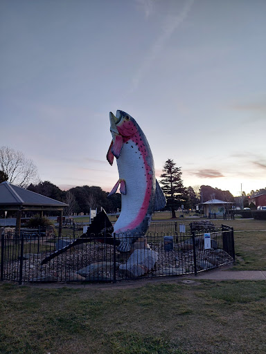 The trout stands just off the Snowy Mountains Highway at the entrance point of the Adaminaby shops district in a nice picnic area where there are tables to have a bite to eat, and there is a toilet block here...
