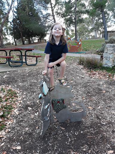 The playground is good for toddlers up to lower primary age, and has covered picnic areas, benches, toilets and drink fountain nearby. It is not fenced, but doesn't really need it as it is far away from roads, and downhill from the car parking areas.