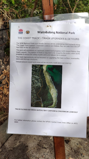 Closed from Bateau Bay car park to Crackneck lookout until June 2021. See photo for details. The section from Crackneck to Wyrrabalong lookout is open and a great walk, a few stairs though but...