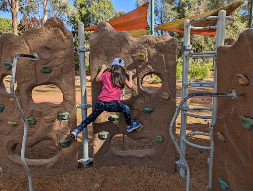 We adore this playground, they have really made it well. My boys are 2 & 4 now & though the 2 year old needs some help getting onto things, my 4 year old does it all himself & even if he falls, the shortfall around the swings & slides is perfect, never hurts him. So much to see with the sand, dinosaur footprints to jump in, dinosaur to sit on & pat, rockwall, maze, flying foxes, disability swing & flying fox is also great for my friends with kids who need that, great little bridges at the edge of the park near the gutter where we park, lots of bins & places to sit. Toilets close by & are always clean (whenever we've been). Our favourite park by far. Can get crowded. We try to go on school days of a morning & not in the holidays...