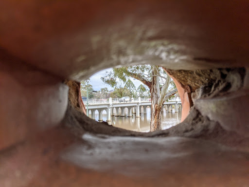 A fascinating intriguing tactile "sculpture". To some it does stand out like a sore thumb from its surroundings. But in and of itself, it's evocative. It contains elements I would associate with the fairy folk in fantasy lore. It is located right along the main highway so it is hard to miss. The ground around it is sloped, do take care. There are these circular holes on one side that looks towards the bridge that makes for...