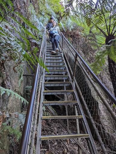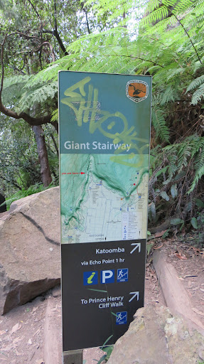 The bottom of the Giant Stairway is only marked by a "you are here" sign and you have three options at the bottom: 1) Head back up the way you came, 2) Take the 1-2hrs walk to the Scenic Railway on your right, or 3) Take the path to your left to continue your bushwalk. We went back up and had a few moments where our legs felt like they'd turned to jelly from all the climbing up!
