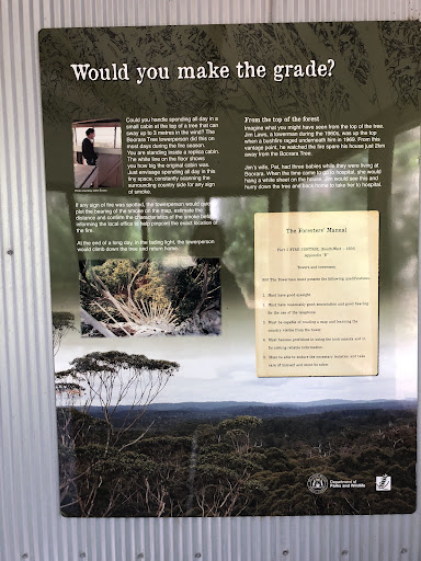 Read moreAn old fire look out tree. Replica hut of what used to be up the top of the tree is next to a small carpark and grassed area with a picnic table. The hut was well maintained and quite an interesting inclusion, with boards about the history and even the old phone used to call through when fires were sighted. There's a couple of designated walk tracks of different lengths beginning here also. Lovely little spot for a stop. Interesting to read the info in the hut and near the tree. The tree can't be climbed, as the pegs and guide wires have deteriorated with age, but it's interesting to see. I think there were also toilets signposted down a track next to the hut, but we didn't go to...