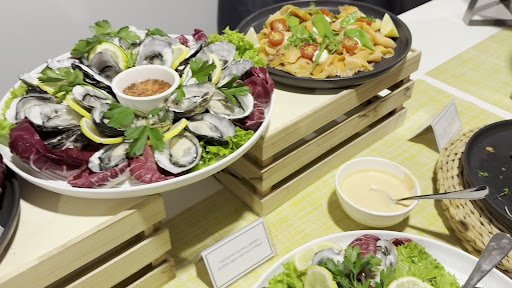 Before the game, there was a great spread of prawns, oysters, smoked salmon, roast meats, and roasted vegetables. The seafood was fresh, the roast meats were tender, and the vegetables were cooked beautifully.