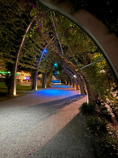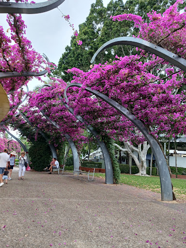 The Arbour Walkway in Brisbane's South Bank Parklands is a 1-kilometer-long arbour known for its distinctive design of 443 steel column tendrils, up to ten metres high, adorned vertically with vibrant magenta-coloured bougainvillea plants. The greening structure functions as a pedestrian walkway which connects the Griffith Film School and Vulture Street to the Cultural Forecourt adjacent to Queensland Performing Arts Centre (QPAC), as well as the rest of the South Bank Parklands through which it runs. The arbour follows the course of the former Expo 88 boat canal, adding a layer of historical context to the structure. It was designed by Melbourne-based architectural firm, Denton Corker Marshall and was opened officially in 2000. It provides a shaded and picturesque route through the parklands, connecting various attractions (Wheel of Brisbane, QPAC, etc.) and offering a tranquil space for leisurely strolls. The Arbour Walkway also features atmospheric lighting, making it a romantic and enjoyable walk...