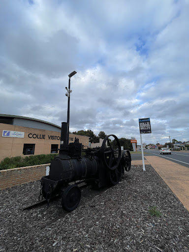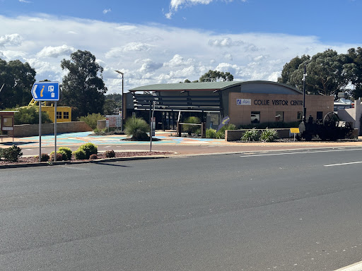 Located on the westen entrance into Collie smack on the highway. Easy to find look for the steam trains with 2 beautifully looked after restored green steam engines and a black one next to a big yellow digger and at roads edge little "Polly" a little rail engine from way back. Oppersite this lovely visitors centre lays the local musum. Full of history. Inside the visitors center u can do a tour stepping back in time down a makeshift mine and learn of the history of Collie coal and mining. The visitor centre has all the info you will need from local accomidation, history, places to go, things to see and do. As well as information on buses that travel to and from collie on a reg. Basis. They also can assist with that gift to take home and all about the local native bush flowers and watering holes. A must stop for a pic with a train or to find out more...