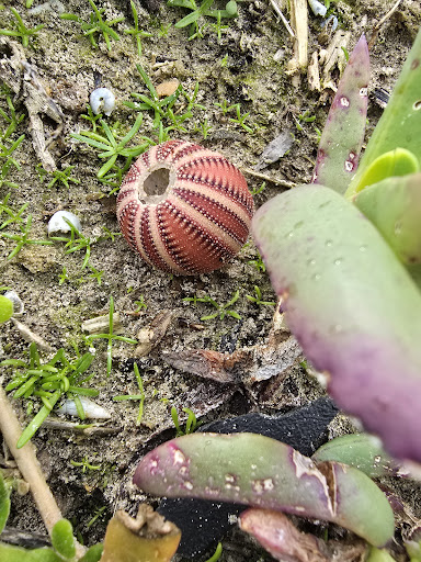 As I rattled along in my old Toyota Hi Ace Van named Cailleach (affectionately known as simpy Cal) I noticed a little signpost with 'The Granites' written on it. Curiosity peaked, Cal, and me, Val, took a lefty turn to go check out what this place was. Im glad we did! It was a wet windy day, and The Granites were showing up at a wilderness-like beach. The only witness to civilisation was a very big flat expanse of bitumen car parking area, with a 4x4 vehicle, a caravan, 2 bikes, a cute dog and 2 humans upon it. Warning signs of the risks entailed in going in the water, or onto the beach, were off to the left where a tumbledown wooden lookout platform was battling the elements, and the elements are winning. In the sea, across the seaweed strewn beach, the big oval shaped Granite rocks were being battered and sprayed with sea spume at mid tide. A desolate but beautiful place and a nice on the way...