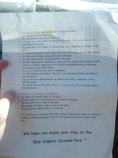 MY ADVICE DO NOT GO ANYWHERE NEAR THE BLUE DOLPHIN CARAVAN PARK - we were staying there and I was verbally abused by the Manager named Barry on Saturday 22nd August 2020. I was taking the dog for a walk after watching my AFL team Western Bulldogs win, as I knew Barry was an avid Bulldogs fan I called into the office which was unattended and called out to him saying “are you there Barry”, he came into the office and yelled “what” I said “ you must be happy with your team’ he responded as he was walking to the back of the office yelling at me with “is that all you fkn want - I am watching it now and am only up to the third quarter” I said “it was a good game” he once again yelled “just F off will you get out of here”. I was quite shocked to be spoken to in that aggressive manner and was very upset. I went for a walk and on the way back stopped to talk to people who were booking into the park they had been abused in the same manner for interrupting his football game. Later I confronted him because of his aggressive outburst – he said it was because I interrupted his football game, and to his credit shook my hand and apologised. I told him I would accept his apology but I will still be making a formal complaint out his unacceptable behaviour. I have since read the reviews on the park and obviously by the reviews this behaviour is common place here at this park which is a shame as it is in a prime position even though it is run down and needs a lot of work the amenities were clean. I have formalised my concerns to the WA Tourism and Shark Bay...