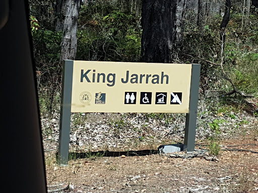King Jarrah tree about 2klms out of the town of Manjimup. Easy access in gravel road, plenty of parking, for long vechiles as well. The main area information board, table and chairs, walking trails. First display is a cut section of a tree, which is a birth tree of Queejup, a Noongar Stockman lived in the late 1800s. Then about 80m to King Jarrah tree which has a elevated boardwalk around the tree trunk. This is a lovely bush setting that is great for picnics...