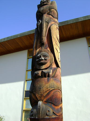 The carvings on the pole relate to Chief Skedans, one of the last survivors of the village of Skedans and grandfather of the carver. The chief is shown in front of the grizzly bear, his family's main crest. Above the bear a Haida moon, another of the chief's crests can be seen, and above that stands the raven with his long beak. Between the ears of the raven is the chief's wife. The wife and daughters of the chief wore an ornament inserted in their lower lip and this is illustrated in the representation of the chief's wife...