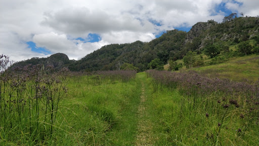 Were one to continue anyway, I suppose there might be a partial track through the wild vegetation at the top of the ridge, smelling of lantana and sage, probably steep rock scrambles, some bushes and trees to clamber past, and 150m more climbing leading to the first of the Buckets peaks with even better views in all directions. It would probably be less fun to scramble back down the rocks, if the heavy rain started when you were at the top. One would then need towels and a change of clothes and shoes at the car. I expect it would be worth it if you like that...