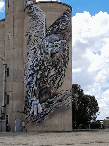 Read moreDrove past here the other day and found the artwork impressive. Goorambat silo art depicts Clydesdale horses these were the backbone of the Goorrambat farming community from the time of the first settlers until long after the first tractor arrived in Goorrambat in 1924. The Australian Barking Owl(also known as the winking owl) and the Iron bark trees play an important role for the Barking Owl and other animals and birds considering the Barking Owl is endangered. The Iron bark tree has also played an important role in the agricultural industry in...