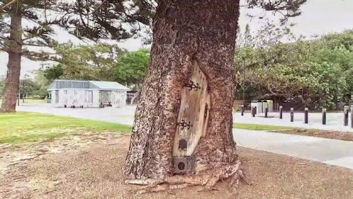 It's certainly interesting, I had to do some research afterwards and was surprised to find the artist who made it is a mystery, nobody knows who transformed this Norfolk pine tree into what it is today. It appeared December 2013 when a large section of bark was removed from the tree and a door was found in its place.