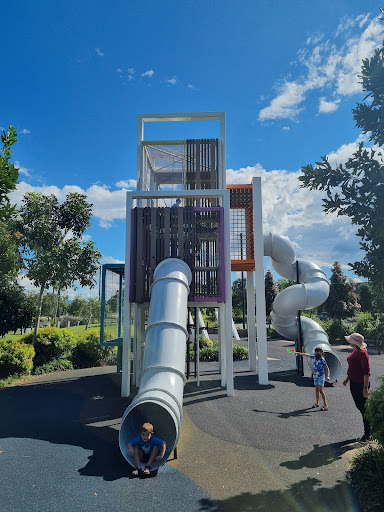 This is a fantastic option for parents to bring the kids to burn some energy. The park has water jets, fountains and a large dumping water bucket, as well as some shallow water channels so the babies can get involved too. There are plenty of shaded seating areas for parents. Next to the wet playground is a dry playground complete with swings, zip line, large climbing tower, revolving equipment and slides, and a smaller climbing playground for the littlies. Toilets are clean and seem to be in working order (apparently 1 door lock is broken), and there are many recycling and red bins dotted around. Drinking water bubblers, an outdoor shower, BBQ facilities, a large oval for ball games, and a defibrillator on site (for emergencies) illustrate that this park was well designed for all eventualities. We will definitely...