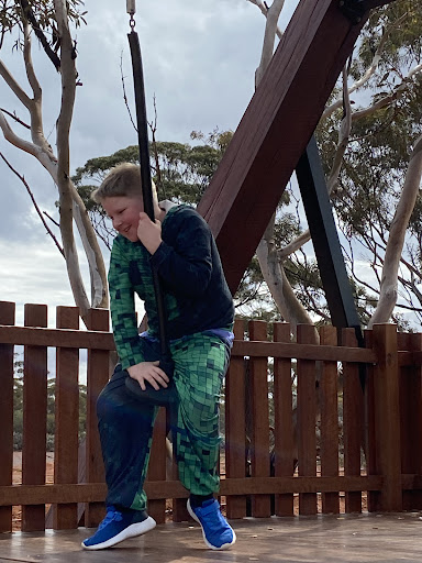 Kalgoorlie should be very proud of this wonderful adventure playground. I went there a few days ago with my grandchildren aged 10 and 3. There was so much for them to do. Their favourites were the big green slide and the flying fox. I have to admit Nana didn't enjoy climbing inside the wooden frame to ensure the safety of the 3 year old on the big green slide. An alternative way to get to the top of the slide would be good. We all loved the flying fox. The harnessed seat was great for both of my grand kids. The 10 year old used the sit on disk as well with no issues. My only gripe would be that there are no areas fully protected from the rain. We left early as we got soaked seeking shelter under the shade cloth. I note that there were BBQ facilities, nature walks, water play, climbing apparatus, musical instruments and a roundabout. Sadly the rain stopped us from trying these out. The flies were annoying so I would suggest...