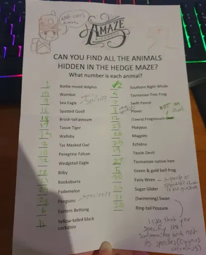 Read moreAlthough generally a mediocre experience, certain parts of this maze were offensive in the fact they spread easily preventable misinformation to young impressionable minds. My issues come from the hedge maze number-the-animals "puzzle". Throughout the maze you find species of animals and must number them on your paper, innocent enough right? Wrong! Multiple bird species aren't even given a species! Example: sea eagle, penguins, fairy wren and swimming swan. Each of these do not acknowledge the specific species of the bird when multiple species fall under these titles! This wouldn't be that bad on its own but it doesn't end there. The most egregious example is "Frogmouth owl". Frogmouth...Owl?... Tawny frogmouths are not owls! This is blatant misinformation! How could you make such a foolish mistake? Tawny frogmouths don't even look like owls, teaching kids this is shameful and you should consider changing how its labled. I have annotated my sheet below if you wish to look but its just everything I listed above. Such a shame this maze had to be soiled by this. Thank you...