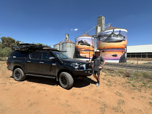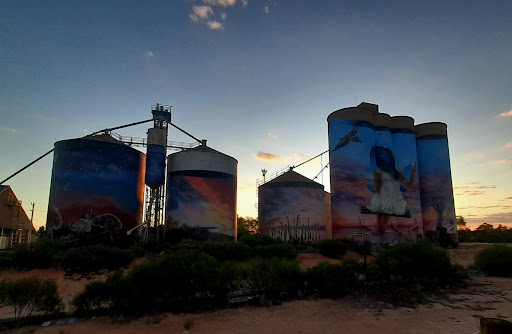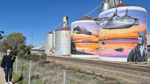 First silos in our journey of viewing these amazing works scattered across the countryside. Brilliant colourful works showing some of our state's history. Appears to be a free camping spot across the trainline where the...
