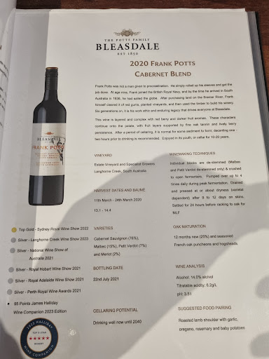 We came across Bleasdale winery just by chance as it was so inviting from the outside with his buildings surrounded by vineyards we thought we would pop in for a quick tasting. Damien, who is actually a direct descendant of Frank Potts whose family have run the winery since the 1850 was there to offer us a sample of their wines. The tasting was $10 per person and it was easy to pick a couple of bottles to take home with us. They were delicious and the information given by Damen was fantastic. He even took us into the barrel room and the museum and explained the history of his family’s vineyard since the 1850’s. We didn’t even realise that they have been a sponsor for the Melbourne football club . But Don’t put that against them because their wines are tremendous we purchased their sparkling rosé, rosé and Sauvignon blanc. We will be back again next weekend for a tasting with our Melbourne friends who are up for...
