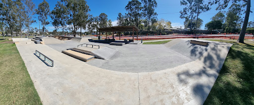 Small not much to do. Excellent skateboard park, great bike on rail ride (you do have to pedal yourself.) Good parking. Free tenice court. Close to Jimboomba sporting facilities. Kids under 10 will stay about 20min and get board. Skate park has seats and a shelter. Usually quite, but gets mega busy when the sport clubs play at home on the weekends. Mainly for locals don't drive across Brisbane just to come to the park. It's the same as any local council...