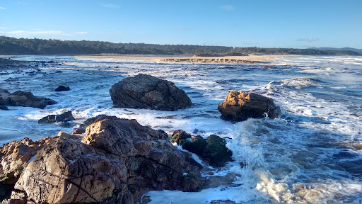 Betka Beach is at a river entrance that may be closed off (warm, still and shallow) or open (fast running and shallow) offering a natural playground for kids. There is surf to play in, rock formations to climb. Has a BBQ and toilets. There are fishing spots and river access. There's also a well made coastal walking track connecting Betka with other beaches, also used by cyclists. There are hermit crabs in the shallow waters and a little turn...