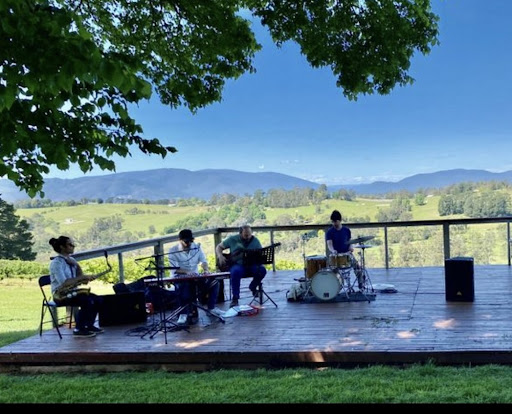 With the backdrop of the hazy blue Warburton ranges, the symmetrical rows of grape vines sloping downwards to the dam beyond & the light summer breezes - it was the idyllic setting to listen to the really good Chris's quartet jazz musicians & enjoy Seville Hill house wines, the tasty, fresh light lunch menu & grazing platters. The massive canopy of Elm trees provide shade but lawn is exposed. Welcome to bring picnic rugs, chairs etc as table settings are limited.