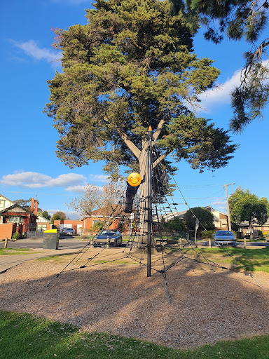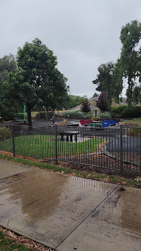 A big park that has a very long side 3 normal swings, two toddler swings and two bird nest swings. Flying fox,seasaw, a wheel to spin that makes noise, a obstacles climbing structure that has a small rock climbing wall rope ladders and discks and another rope climbing structure, spinning carousel that you can also climb on, 3 drums connected together, sand pit, speak and listen system and gym equipment. Also a big historical steam train that is for viewing only. There are a couple different toilet blocks,drinking taps, barbecues, undercover tables with bench seats, other tables with bench seats not covered and other seats around. Lots of grass area for kids and dogs to play on. Also a bridge you can stand on and see the brids ducks and swans...