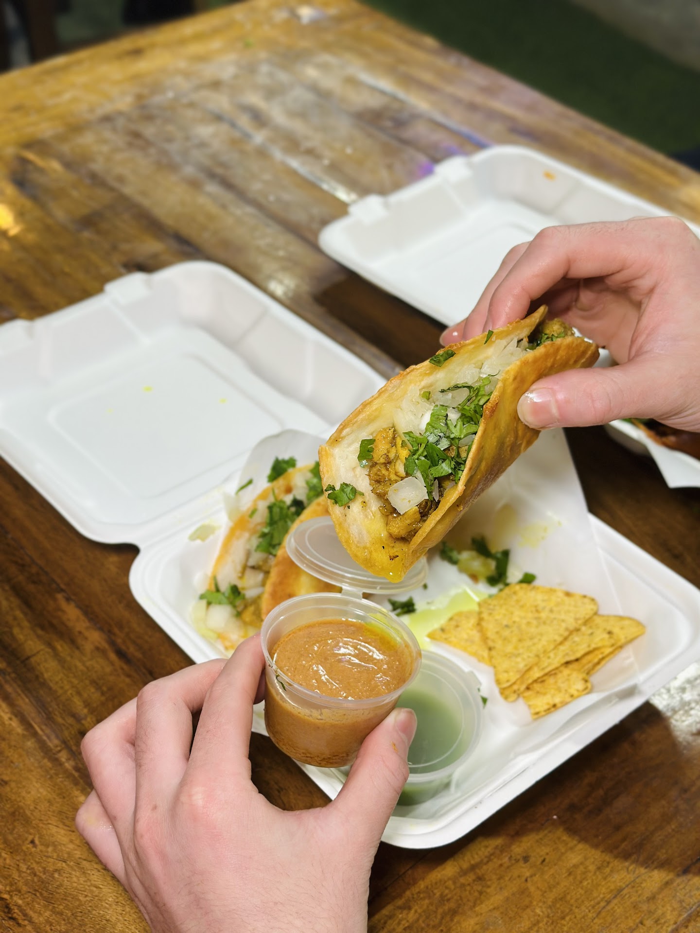 Honestly very disappointing with the tiny tub of consumme. We came there first time with my bf for birria tacos yesterday after seeing the tiktok, and craving it for months, they opened at 4pm but said there was an over hour wait for the thai milk tea to be done so we couldnāt get the trio fiesta set which cost $29 per set, we were gonna get 3 sets but since they didnāt have milk tea we opted to buy it individually instead (3 rendang/3 tulang/3 originals) costing us $80 in total $8.90 each, so i expected each individual tacos to come with each tiny consumme tub specially for the price of $8.90 each, but they gave 3 consumme tubs and theyāre tinyyyy, understandable if i order the trio set and it came with milk tea and one tiny consumme tub i would have thought āoh okay its probably how they do their setā so my question is, what if i buy just one taco? That means i dont get any consumme? It tastes really good, but obviously the dipping in the consumme part is the best! Anyways, one star for being stingy with consumme...