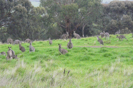 We went to Morang Wetlands to see the Kangaroo mobs. We arrived on Friday, March 13 after 6:00 pm. Animals tend to eat at dusk. The signs for the park indicate that the park closes at 7:00 pm, so we had to make it quick. It was rainy and chilly, but we got out to try our luck. About 5 minutes into our stroll we came across about a group of 12 kangaroos and then a group of a few more. When reached a large field we found it full of kangaroos, maybe 40 or 50. We stayed back and watched them. Two kangaroos persistently boxed each other.