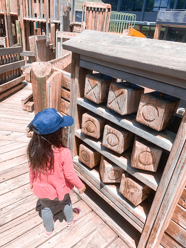Phoenix Park Playground is wonderful! The large wooden fortress-like structures provide plenty for the kids to explore, accessible enough for kids aged 2-3 to play independently, but challenging and exciting enough to keep older kids entertained for hours. The ~5ft fence on all sides means parents can relax on the many benches and picnic tables surrounding the play area. The playground surface is deep tan bark too, so even tumbles from a few feet up will be quickly brushed off before play resumes...