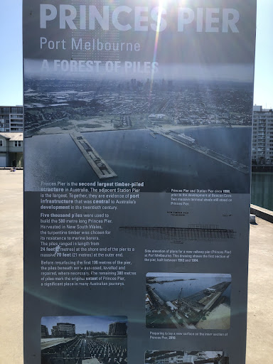 Information Boards: Princess Pier Port Melbourne a forest of piles Princess Pier is the second largest timber piled structure in Australia. The adjacent Station Pier is the largest. Together they are evidence of port infrastructure that was central to Australia's development in the 20th century. 5000 piles were used to build the 580 meter long Princess Pier. Harvested in New South Wales the turpentine timber was chosen for its resistance to marine borers. The piles ranged in length from 24 feet at the shore end of the pier to a massive 70 feet (21 m) at the outer end. Before resurfacing the first 196 m of the pier, the piles beneath were assessed, levelled and repaired where necessary. The remaining 380 m of piles mark the original extent of Princess Pier, a significant piece in many Australian journeys. Photo at top: Princess Pier and Station Pier circa 1990 prior to the development of Beacon Cove. Two massive terminal sheds still stood on Princess Pier. Photo diagram: Side elevation of plans for a new railway pier at Port Melbourne. This drawing shows the first section of the pier and between 1912 and 1914 Photos: Preparing to lay a new surface on the intersection of Princess Pier 2010