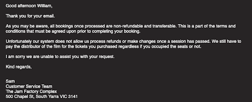 Since this initial disaster, I have switched to Hoyts and have been pleased with the simplicity and functionality of their service and website. It's a stark contrast to the complexities and inefficiencies I've endured with Village Cinemas.