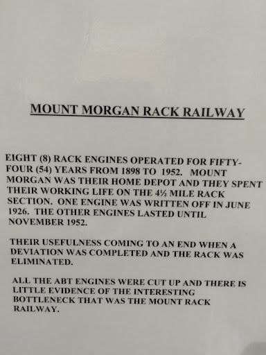 This museum is one the best in CQ and for railway enthusiasts, it boasts the last 2 ABT 0-4-0 locomotives used on the Mt Morgan line. A QR 1960s Rail Motor 2014 has been restored and can be accessed by visitors. There is an excellent 20 min audiovisual movie with a 3D view part that covers the history of the line and the ABT rack system, one of two in Australia. Entry is $5.50 (no concession). The Mount Morgan Railway Station has been fully restored to its former glory and houses the Information Centre and museum, which showcases an extensive collection of historic railway material. There are clean restrooms available, postcards and other memorabilia, disability access and ample...