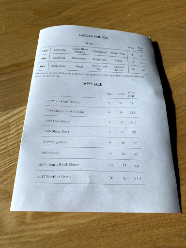 The wine was enjoyable, the Chardonnay medium oak was quite nice and acidic with citric and floral flavours. The Sangiovese was unique and peppery, not in the usual way, with hints of peppermint and blueberries, a tasty wine. The 2018 shiraz also quite enjoyable it had an oily mouth feel and rich berry flovours. We also loved their sparkling wine which had lovely light sweet flavours and would go well with wine and cheese.