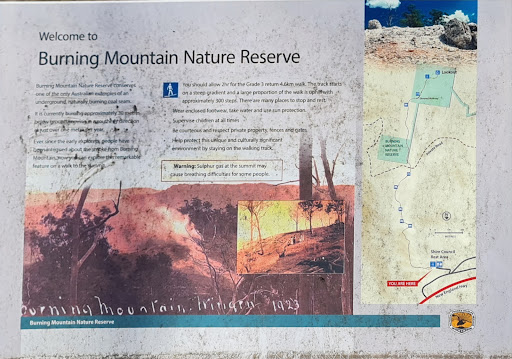 Read moreA nice stop at the side of the road when you are travelling through and want to relax your legs on a short hike. Be prepared to expect funny fumes smelling like rotten eggs during the hike...the smell of H2S. The charcoal layer inside the mountain is indeed still burning! Two basic, but clean toilets are supplied in the parking area and non potable water, though it looks like the Council has forgotten about the place: The only wooden seatbench was broken and the benches in the little information pavillon full of bird sh®® This place could look much nicer with some more love and Council attention - no big...