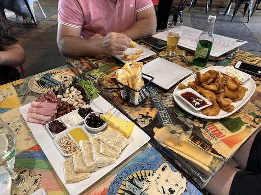 The food was amazing. First we were given a produce board with cheese, fried pizza dough, bread, nuts and some meat. Everything was fresh and delicious. We were then given some onion rings battered with house beer and some chipotle sauce which was just as good. Finally we ended with a Kangaroo pizza. Neither of us have had kangaroo and we really loved it.